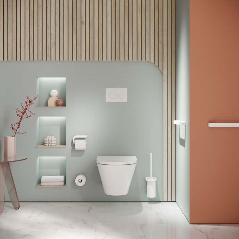 Manche Bäder sollen nicht nur gut aussehen, sondern sich auch im Alltag angenehm anfühlen. Die besonderen Badaccessoires aus dem System 800 greifen genau diesen Gedanken auf: Mit fließenden Formen und klarer Gestaltung wirken sie ruhig, unaufdringlich und gleichzeitig durchdacht. Ihre abgerundeten Linien sorgen für ein angenehmes Erscheinungsbild und erleichtern die tägliche Nutzung – ganz selbstverständlich.