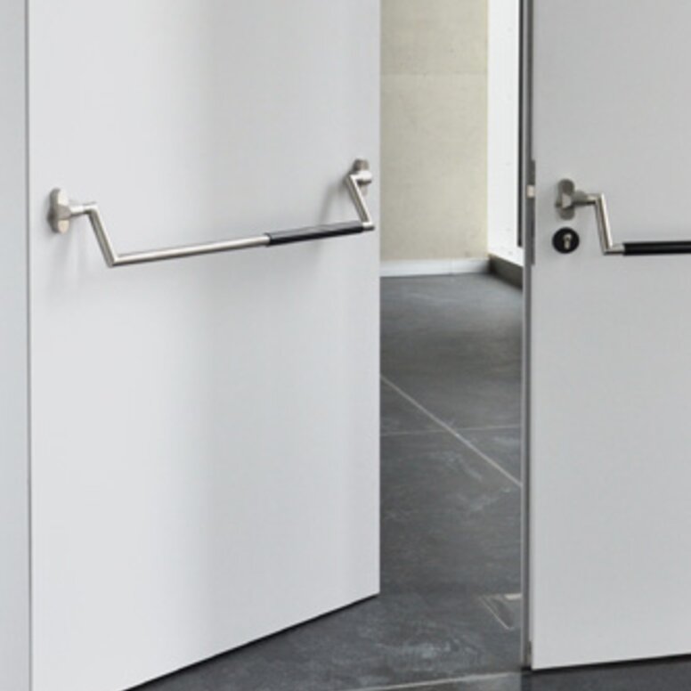 Im Gegensatz dazu steht der Verwaltungs- und Seminarkomplex, der transparent mit einer Glasfassade gestaltet ist und beispielsweise durch eine dezentral angelegte Technik ein Höchstmaß an flexibler Nutzung und Vernetzung bietet. Der Gegensatz von offen und geschlossen findet sich in den gewählten Schwarz-Weiß-Kontrasten wieder. Im Laborbereich sind die Wände schwarz und die Böden aus weißem Epoxidharz gestaltet. Im Seminarbereich dagegen sind die Wände weiß und die Böden mit schwarzem Teppich ausgelegt. Die dynamische Form des Verwaltungsgebäudes findet sich in der fließenden Form der Türdrücker wieder. Hier wurde Serie 120 in Schwarz eingesetzt.