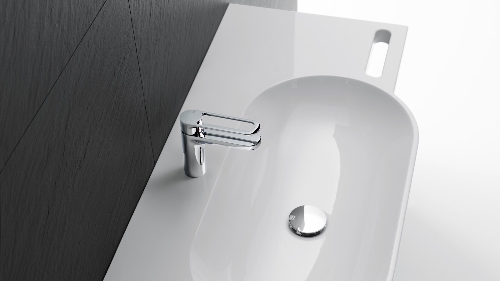 The models have an oval basin and front-mounted grab rails that can also be used as towel rails. Customized washbasins allow solutions to be realized that are a perfect fit, so that the washbasins can be perfectly integrated into the sanitary room.