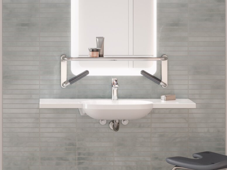 The LifeSystem mirror shelf with its integrated handles provides a secure hold. With the help of the handles, the patient can stand up independently at the washbasin and can find a secure handle to hold onto when sitting or standing. The handles are made of high-quality polyamide, which has an especially pleasant feel.