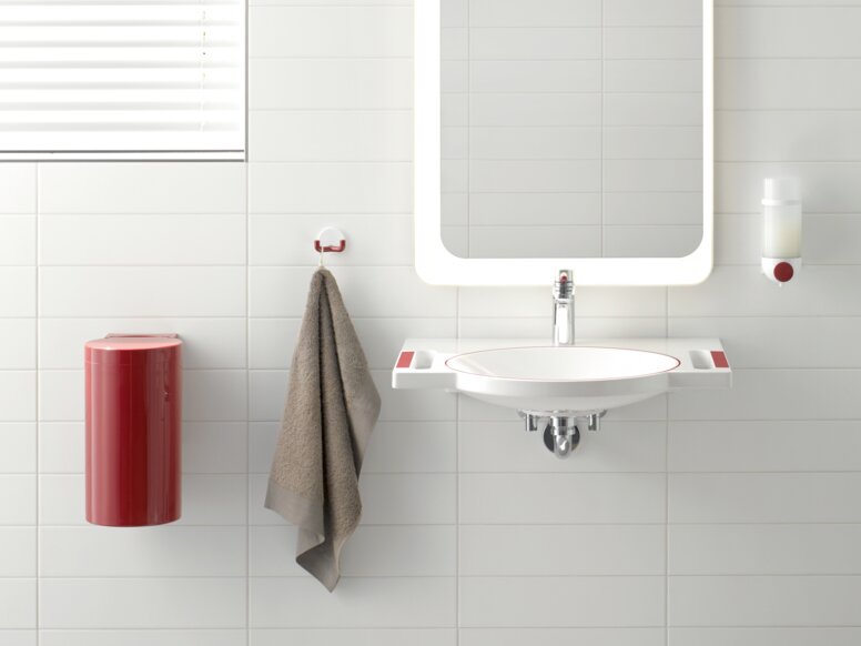 The system is characterised by the targeted use of high-contrast colours. 800 K System is particularly suitable for the care sector due to the material. The modularity of the system allows the sanitary room to be equipped with everything from classic accessories and comfort products to products for standardised, barrierfree areas.