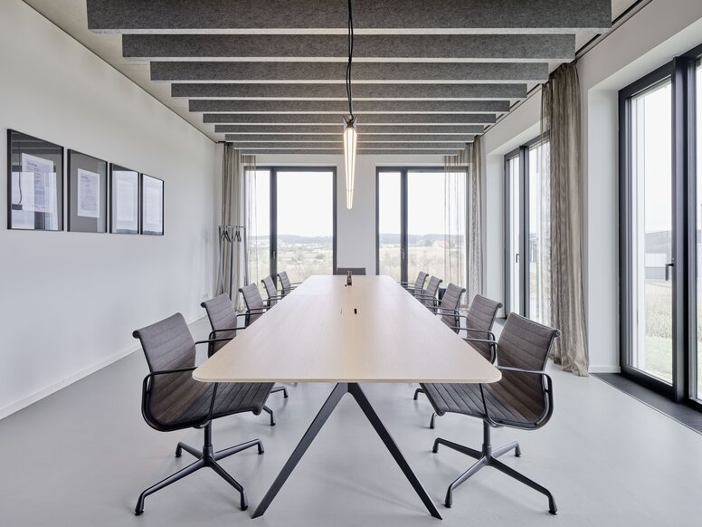 Prostą elegancję i powściągliwą harmonię powierzchni i kolorów można znaleźć w zalanej światłem części konferencyjnej administracji. Klamki okienne z systemu 162 firmy HEWI komponują się wizualnie z ramami okiennymi w tym samym kolorze: