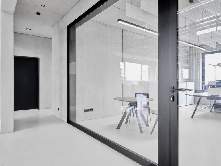 Wewnątrz architekci wdrożyli wyraziste zasady projektowania przejściowego. Cała hala produkcyjna lśni niemal sakralną bielą. "Kazaliśmy nawet pomalować dźwig towarowy na biały kolor", wyjaśnia architekt prof. Alexandra Röing, znana jako Nölke, i kontynuuje: "Celowo zrezygnowaliśmy z niespokojnego wyglądu, który zwykle można znaleźć w warsztatach i halach produkcyjnych". Pozostałe kolory i materiały również tworzą przejrzystość. Charakterystyczny jest biały kolor, a odsłonięte betonowe powierzchnie i czarne elementy nadają skrzydłu administracyjnemu jednolity, powściągliwy i elegancki wygląd.