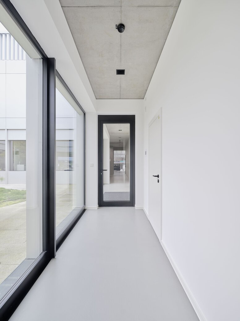 800 z 4800 metrów kwadratowych powierzchni użytkowej przeznaczone jest na administrację. Znajduje się na szczycie budynku, na wysokości dwóch pięter i jest rozplanowany wokół zielonego, przypominającego park wewnętrznego dziedzińca o wysokiej jakości. Pozostałe 4000 metrów kwadratowych to powierzchnia produkcyjna i magazynowa. Podłużna hala, która bezpośrednio sąsiaduje z budynkiem administracyjnym, ma dwa korytarze. Smukłe żelbetowe kolumny wspierają filigranową stalową konstrukcję. Trzy dachy ze świetlikami nadają budynkowi rytm.